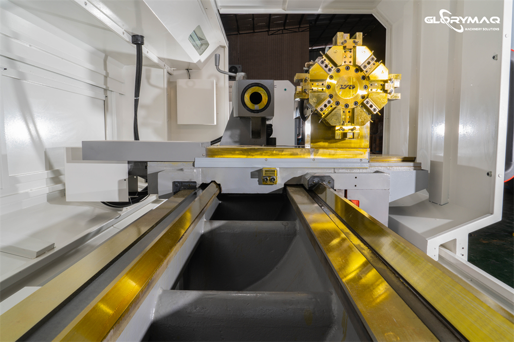 Soustruh GM-6180B je postaven na masivním plochém loži, které zajišťuje vysokou tuhost a stabilitu obrábění. Konstrukce umožňuje spolehlivý provoz i při větších řezech a vyšších zatíženích, což usnadňuje obrábění objemnějších dílů a náročných materiálů.